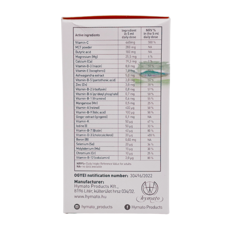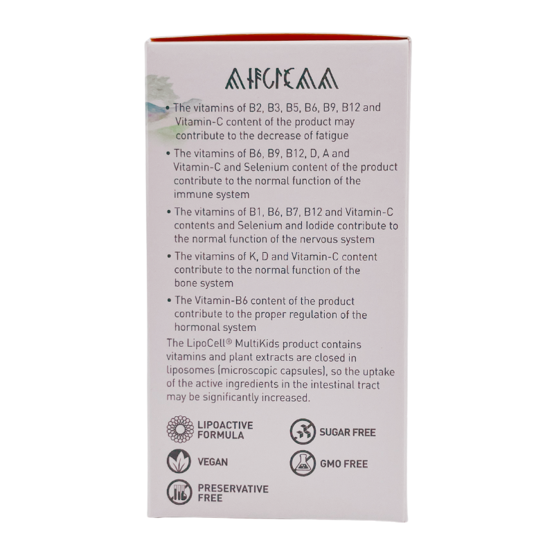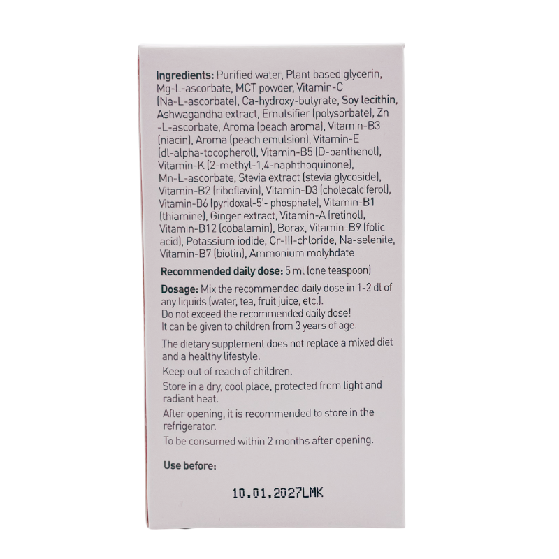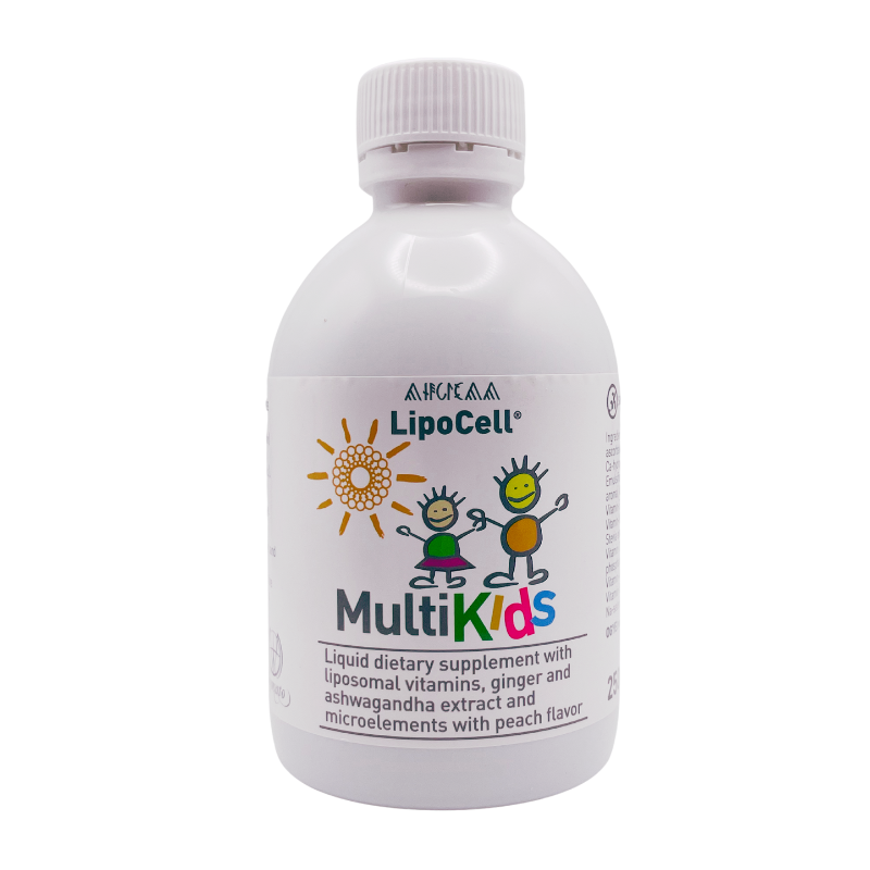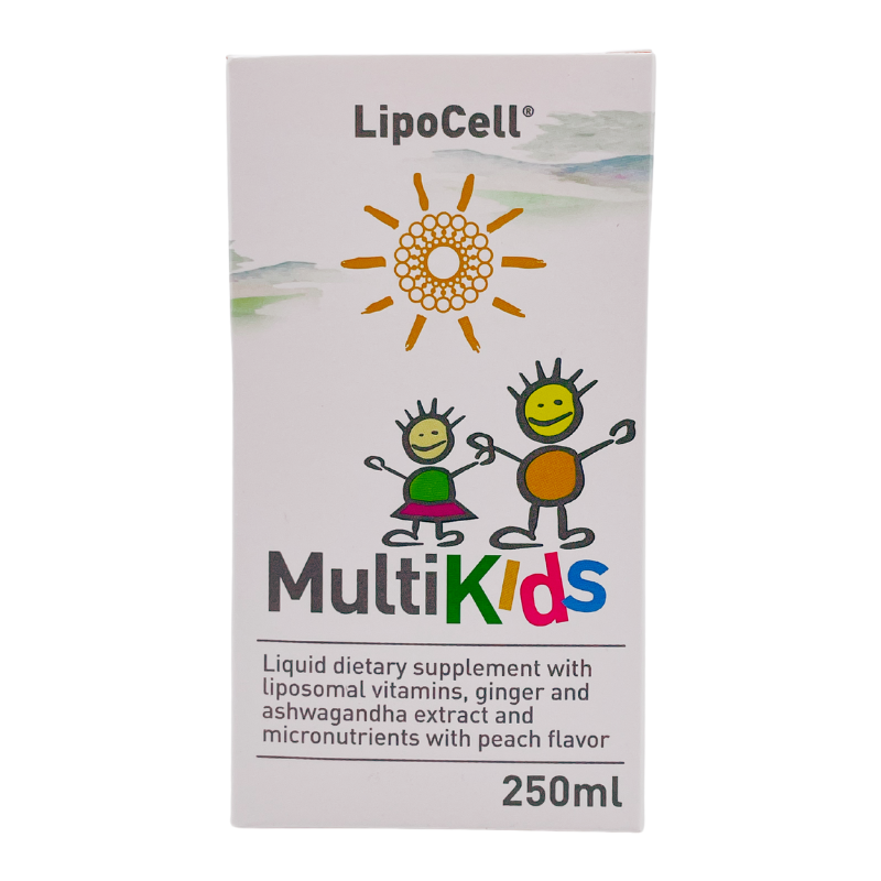 LipoCell MultiKids is a liquid dietary supplement specially developed for children, made with liposomal technology, which, with its delicious peach flavor and effective ingredients, supports the immune system and vitality of the developing body. The product contains the most important vitamins, minerals, as well as ginger and ashwagandha extracts, which together contribute to children's health, maintaining their energy levels and increasing their stress tolerance.